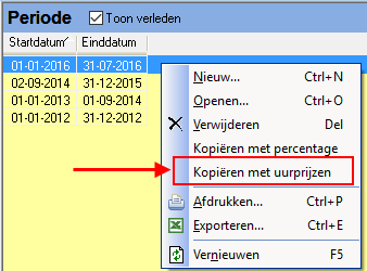 U kopieert de huidige periode via Kopiëren met uurprijzen en u geeft de nieuwe periode de juiste start- en einddatum. Vervolgens past u de uurprijzen aan. Deze aanpassing kunt u voor alle producten met dezelfde uurprijs tegelijk doen. Ook is het mogelijk om per product de uurprijs aan te passen.
