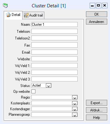 Wanneer u flexkids in gebruik neemt is er al een cluster in de flexkids database aanwezig: het basis-cluster. U moet de gegevens van dit basis-cluster vervangen door de gegevens die op uw organisatie van toepassing zijn.