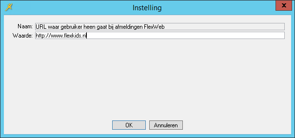 Het is ook mogelijk om na het afmelden uit het klantportaal de ouder naar een andere pagina te leiden, bijvoorbeeld de webpagina van uw opvangorganisatie. Om dit mogelijk te maken vult u als applicatiebeheerder de URL van het webadres in de parameter URL waar gebruiker heen gaat bij afmeldingen FlexWeb.