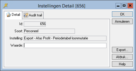 In de export van de personeelsuitbetaling is de standaardwaarde van de periodetabel voor de loonmutaties 5. Als deze waarde aangepast dient te worden vult u de juiste waarde in bij de systeemparameter Export - Afas Profit - Periodetabel loonmutatie.