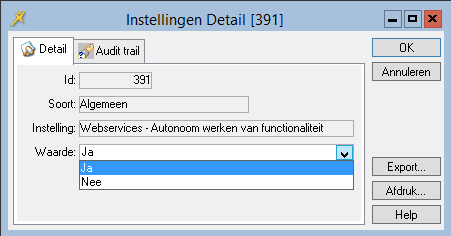 Voor het Autonoom werken van de functionaliteit is het noodzakelijk dat de systeemparameter Webservices – Verplicht valideren de waarde Ja heeft.