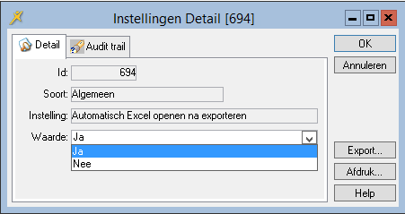 U geeft de systeemparameter Automatisch Excel openen na exporteren de waarde Ja als u wilt dat na het uivoeren van een export naar Excel (via de RM-menu-optie Exporteren) de export direct in Excel geopend wordt.