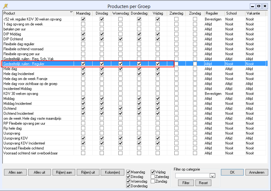 Vink in het venster Producten per Groep de dagen aan waarop het product geplaatst (geruild) moet kunnen worden.