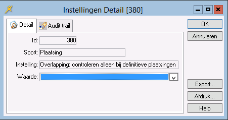 Indien u Ja kiest zal bij een reservering geen controle plaatsvinden, alleen indien een definitieve plaatsing wordt gemaakt. Als in de laatste situatie wel al een andere plaatsing aanwezig is met de status Gereserveerd en bij instelling Overlapping: controleren op overlapping is gekozen voor de optie Binnen meerdere plaatsingen dan wordt tussen deze en de nieuwe plaatsing geen controle uitgevoerd, wel als de bestaande plaatsing ook al definitief is.