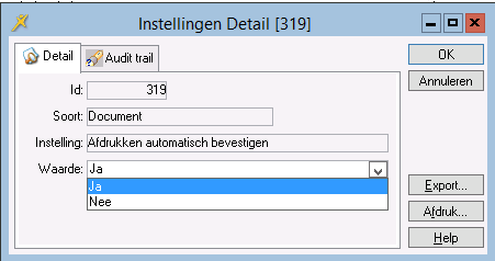 Met deze parameter bepaald u dat de optie Afdrukken bevestigen bij het afdrukken van documenten standaard ingeschakeld staat. Zodra een document is afgedrukt staat in de kolom Geprint de waarde Ja.