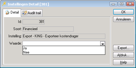 Met de instelling van deze parameter wordt in het exportbestand van King de kostendrager geëxporteerd.