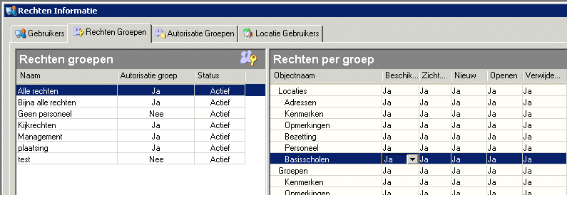 Zorg ervoor dat voor de desbetreffende rechtengroepen in de regel Basisscholen van het onderdeel Locaties alle opties zijn geactiveerd:
