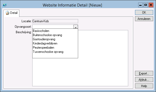 U kunt extra informatie over de locatie tonen in de desbetreffende flexweb-pagina. U kunt bijvoorbeeld de combinatiedagdelen toelichten indien u hier gebruik van maakt. Een andere mogelijkheid is dat u in de beschrijving wilt verwijzen naar een webpagina in de bedrijfswebsite van de opcvangorganisatie. U voegt dan in de locatiebeschrijving een hyperlink toe. Zie Hyperlinks toevoegen aan een locatiebeschrijving.