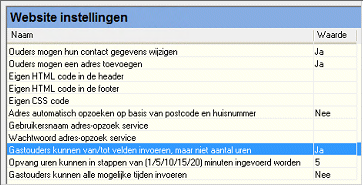 Er zijn een aantal parameters waarmee u de wijze waarop gastouders uren kunnen registreren via flexweb-gastouder kunt beïnvloeden. U doet dat (per website) via Beheer>FlexWEB>Websites>tabblad Instellingen (deelvenster Website instellingen):