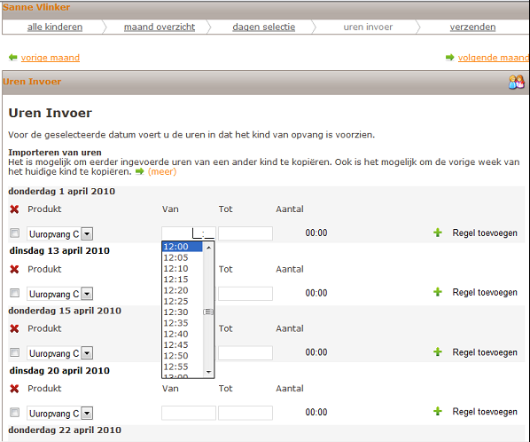 Opvanguren kunnen in stappen van (1/5/10/15/20) minuten ingevoerd worden Hier selecteert u het tijdsincrement dat de gastouder gebruikt om tijd te registreren. Als bijvoorbeeld is gekozen voor 5, dan kan via de webpagina waar de gastouder tijd registreert deze in stapjes (incrementen) van 5 minuten worden geregistreerd. De lijst van keuzelijstveld Van op deze webpagina is opgebouwd op basis van hetgeen is geselecteerd in deze website-instelling. Zie onderstaande afbeelding.